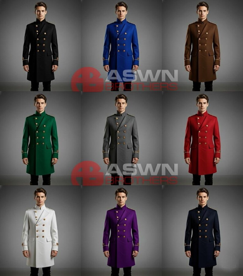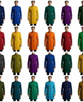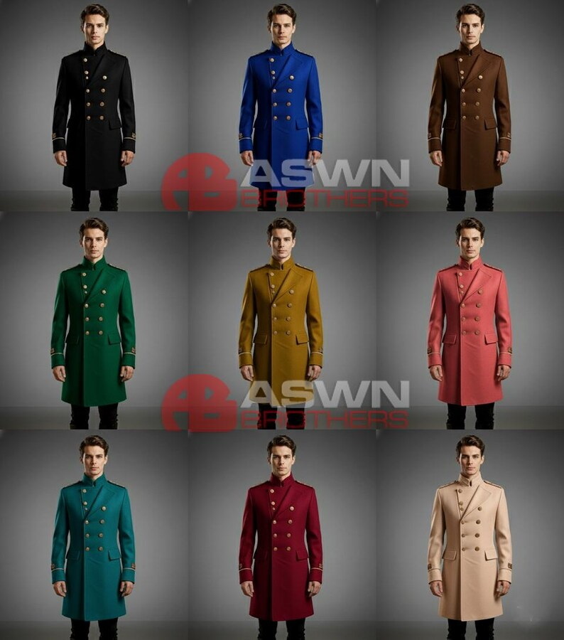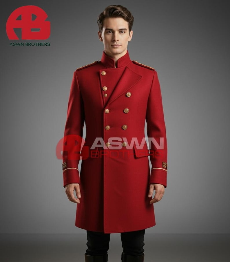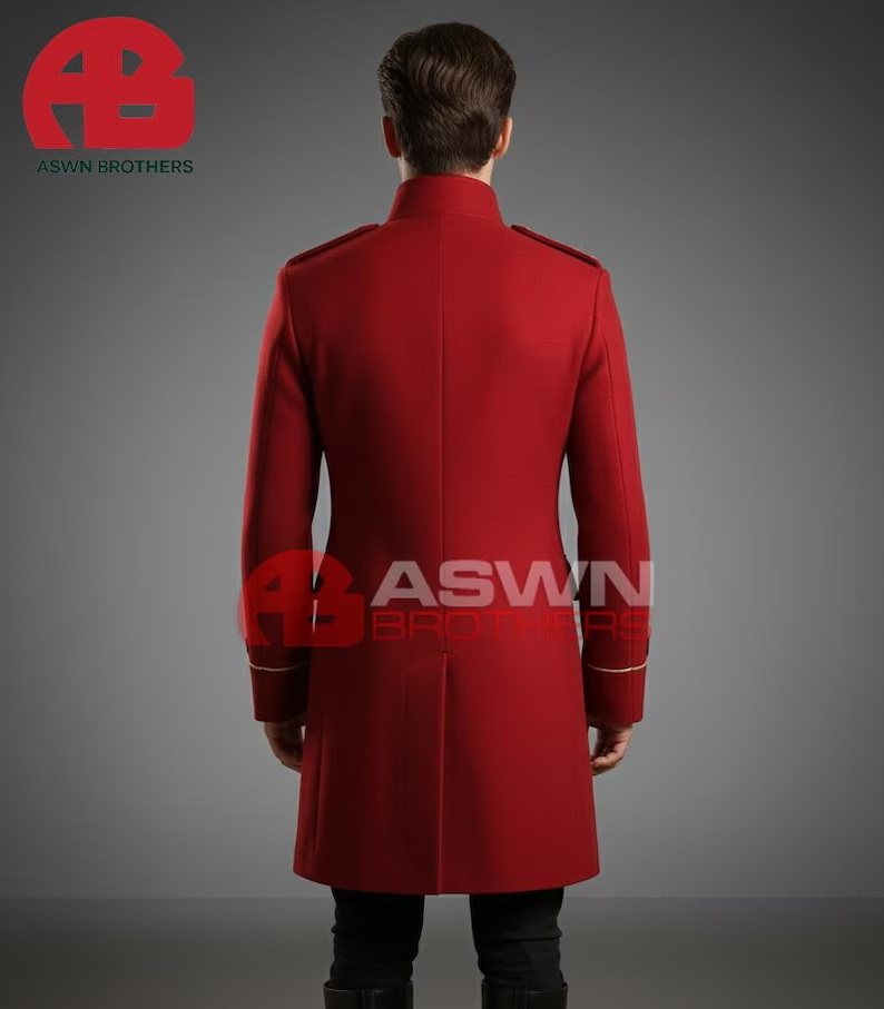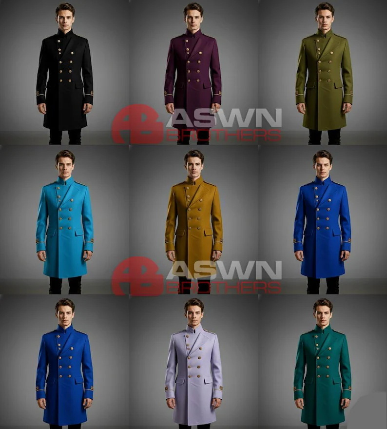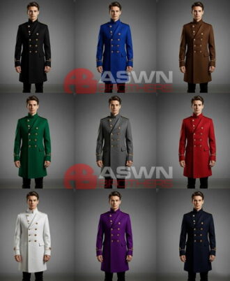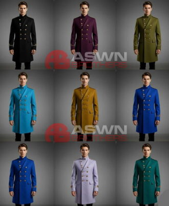 The high stand collar and structured shoulders with golden epaulettes enhance the noble silhouette, while flap pockets and cuffed sleeves with gold trim embroidery add subtle detail to the design. The tailored fit extends slightly below the knees, giving it the commanding stature of a formal officer’s coat.