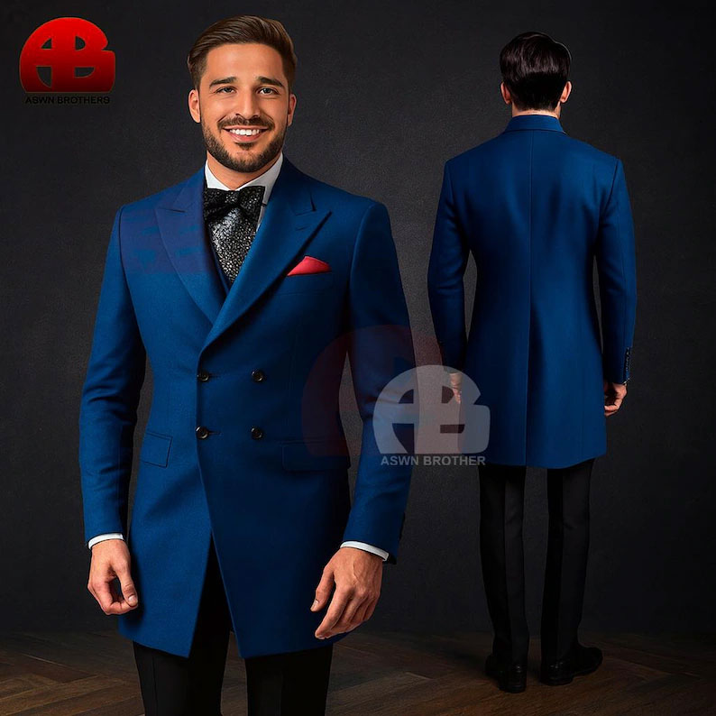Men’s Elegant Royal Blue Double-Breasted Wool Coat With Black Trousers – A Bow Tie And Red Pocket Square – Perfect Blend Of Classic Charm